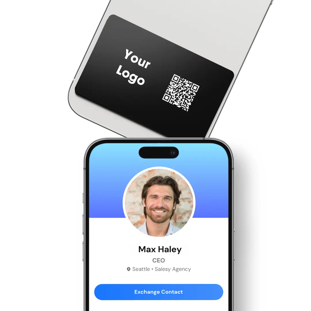 - Apply to Back of Phone: This digital business card can be easily applied to your phone and is equipped with an NFC tag for instant contact sharing. Tap on the back of an iPhone or center-back for Android.